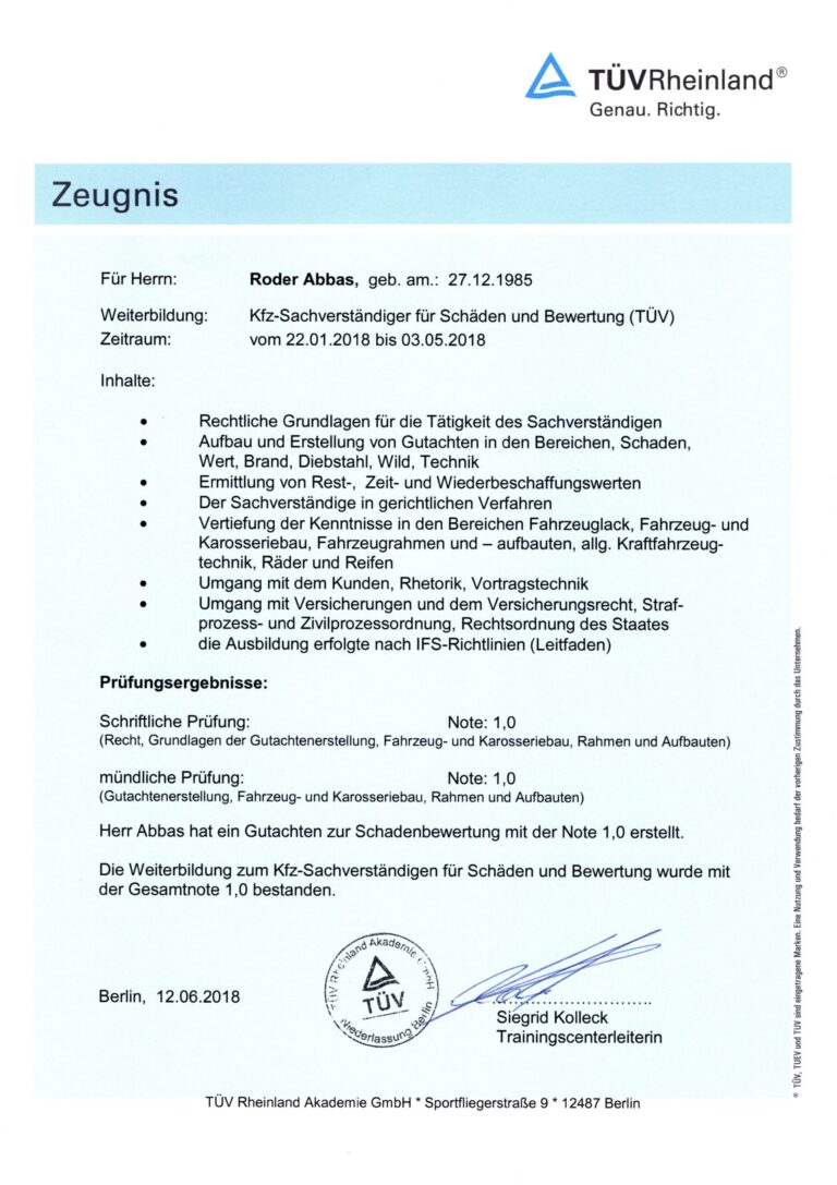 Nach dem Ingenieurstudium an der TH Köln, hat Roder Abbas beim TÜV Rheinland die Weiterbildung zum Kfz-Sachverständigen erfolgreich absolviert.
